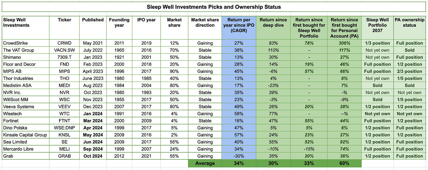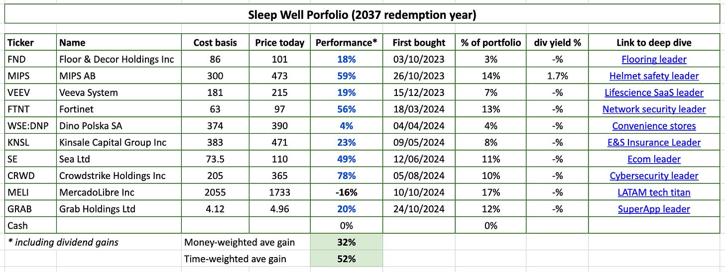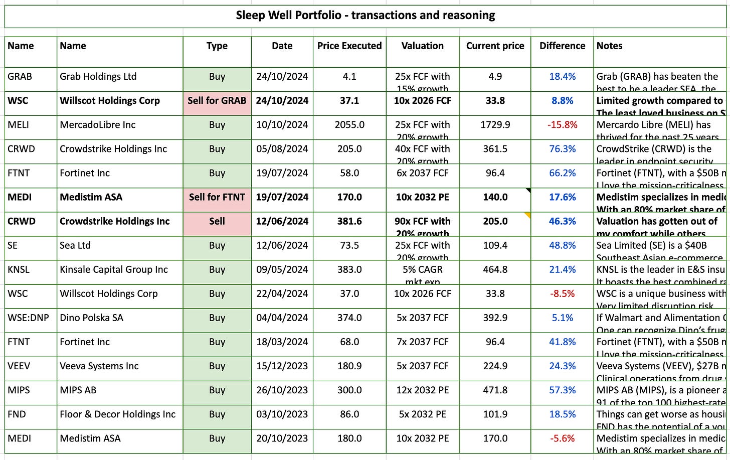 I used to limit my allocation to 5% of the portfolio for any given stock. However, that would be a waste of my deep understanding of a few stocks I cover. Thus, I have become more concentrated when encountering a business that ticks more boxes on the sleep-well checklist and when I know it well. I have tested this strategy more aggressively in my personal portfolio and started doing the same for the Sleep Well Portfolio (MIPS, FTNT, MELI, SE, GRAB with a 10%+ allocation).