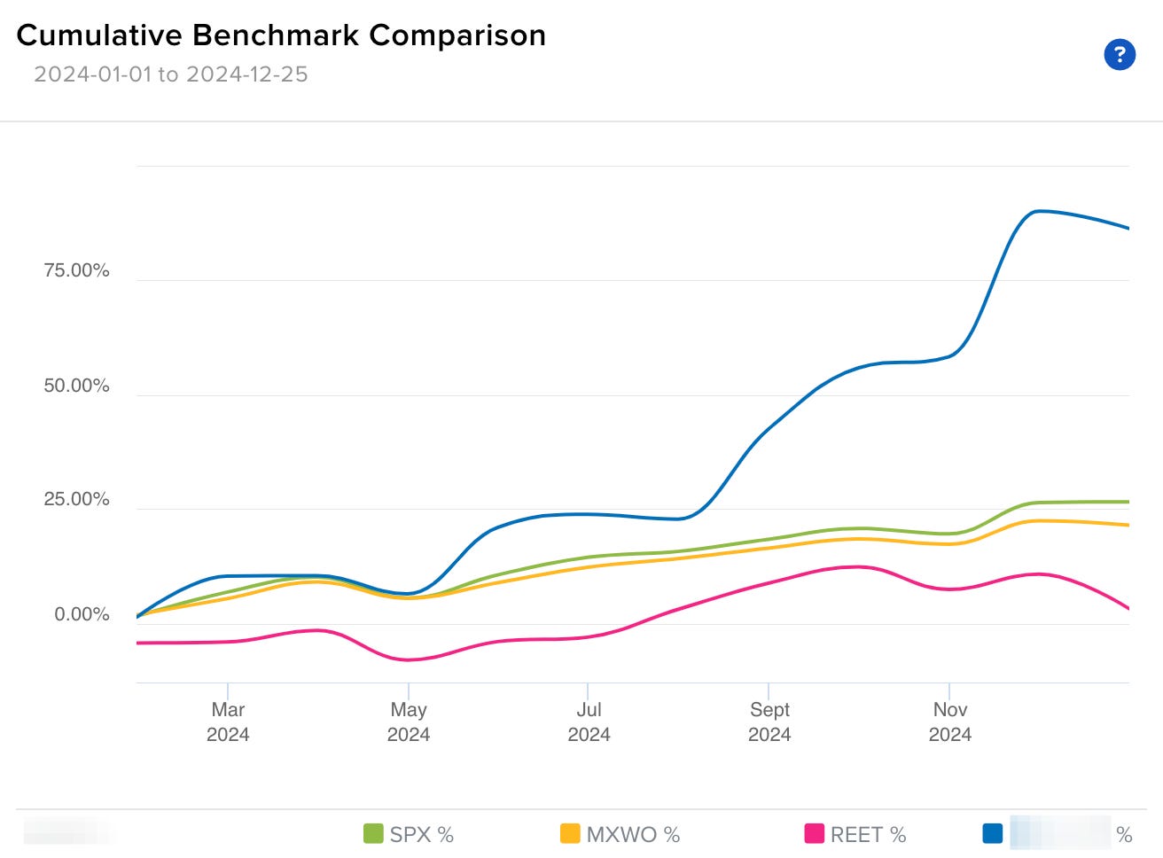 My Personal Portfolio (PA) returned 86%, compared to 26% for the S&P500 (01 January 2024 - 24 December 2024).