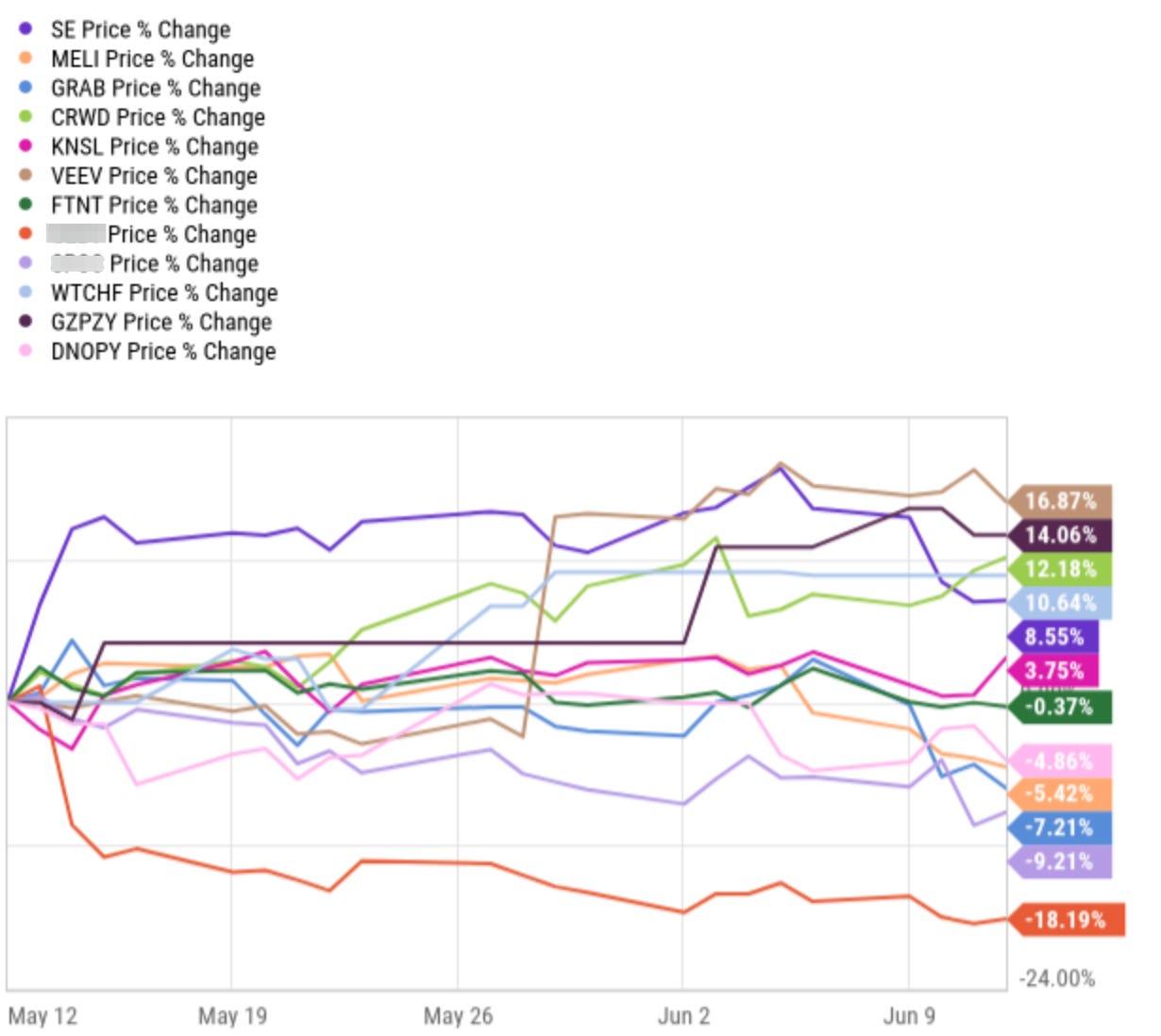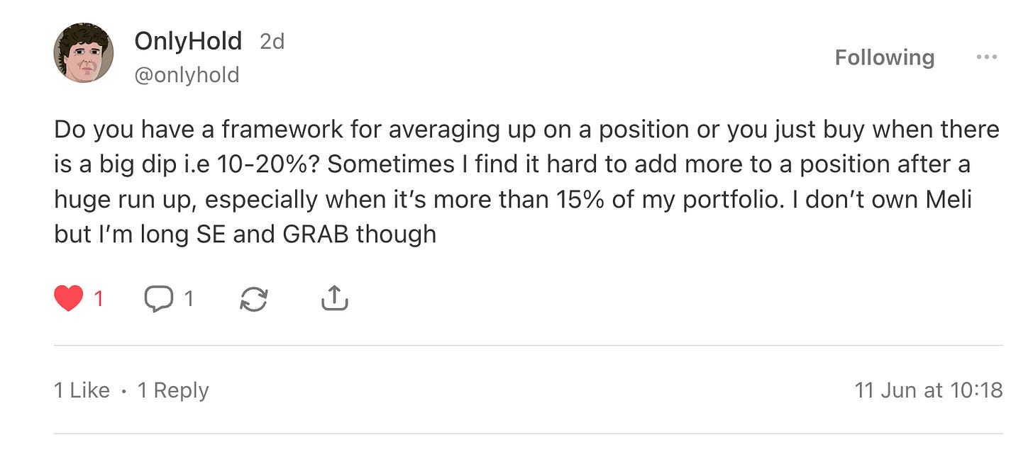 The remaining picks have only dropped a little, namely Grab, Meli, and Dino Polska. Sea Limited dropped in the last week after news of Meli’s increasing investments in logistics (more free shipping for lower ASP items) in Brazil to counter Sea Limited’s formidable growth in the region (10% of Sea’s total GMV and 40% of Meli’s Brazil GMV).
