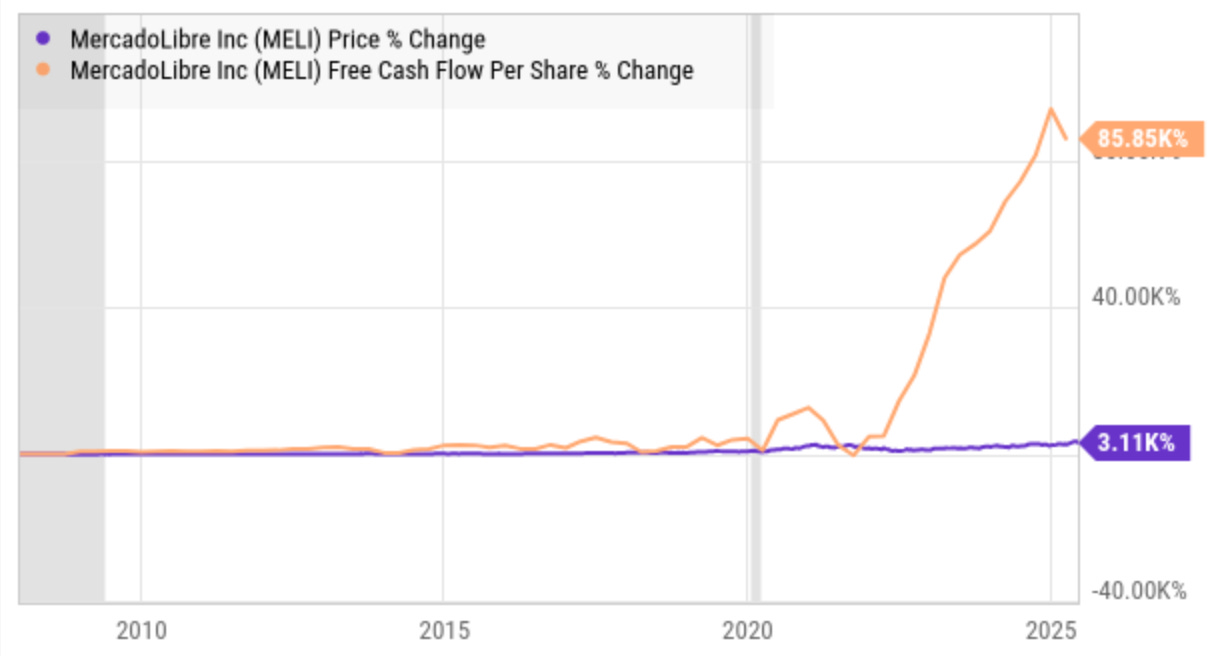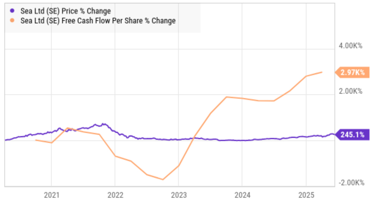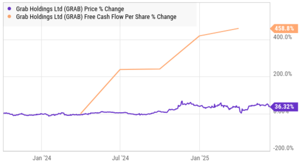Grab has also performed similarly, growing free cash flow per share 10 times more than the growth of its stock.