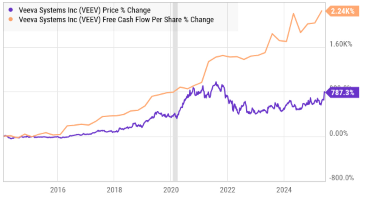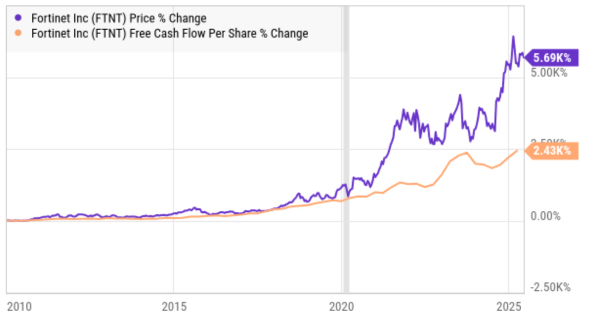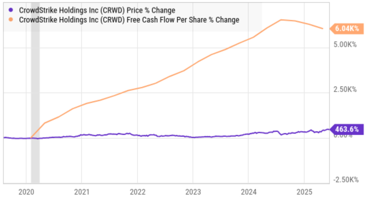 Since turning positive, Crowdstrike’s free cash flow per share has grown more than ten times the share price gain.