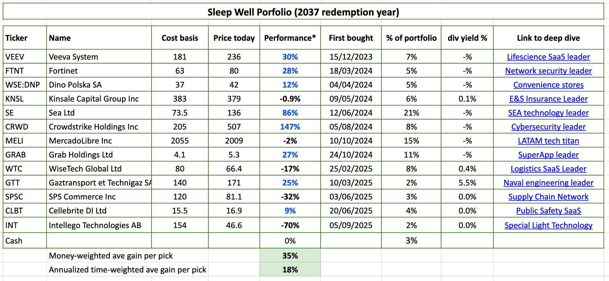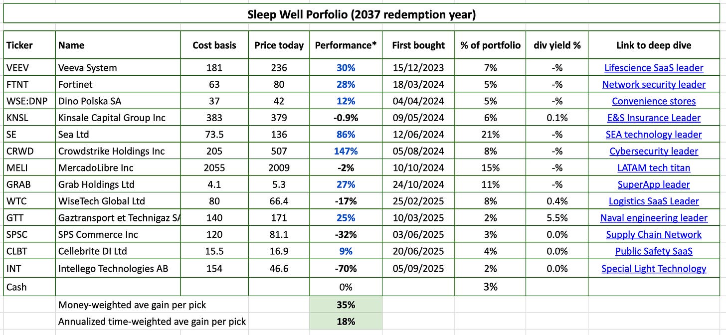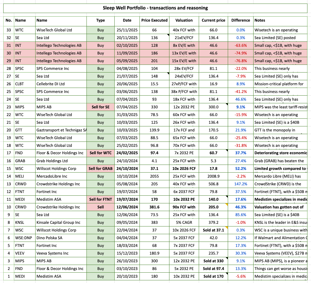 Portfolio as of today, after the transaction. Despite the significant negative impact of my mistake in Intellego, I am happy with the rest of the portfolio companies. I look forward to learn my lessons and adding more to Wisetech, Sea Limited (I already did a few days ago, announced in the chat), Cellebrite, SPS Commerce, and possibly Mercado Libre at current prices. See my recent November Best Buys to understand why.