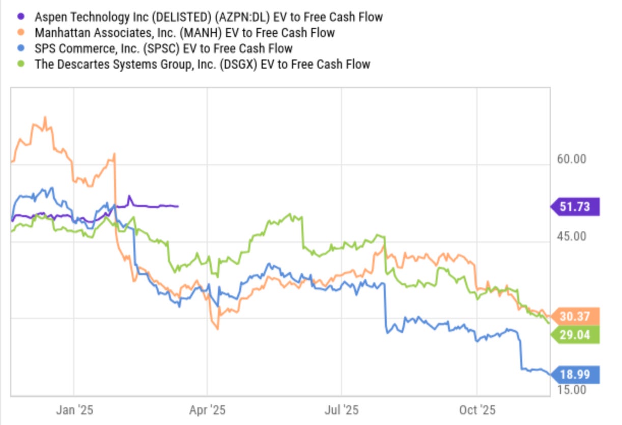 Descartes Systems and Manhattan are trading at ~30x EV/FCF, and SPS Commerce at 19x.