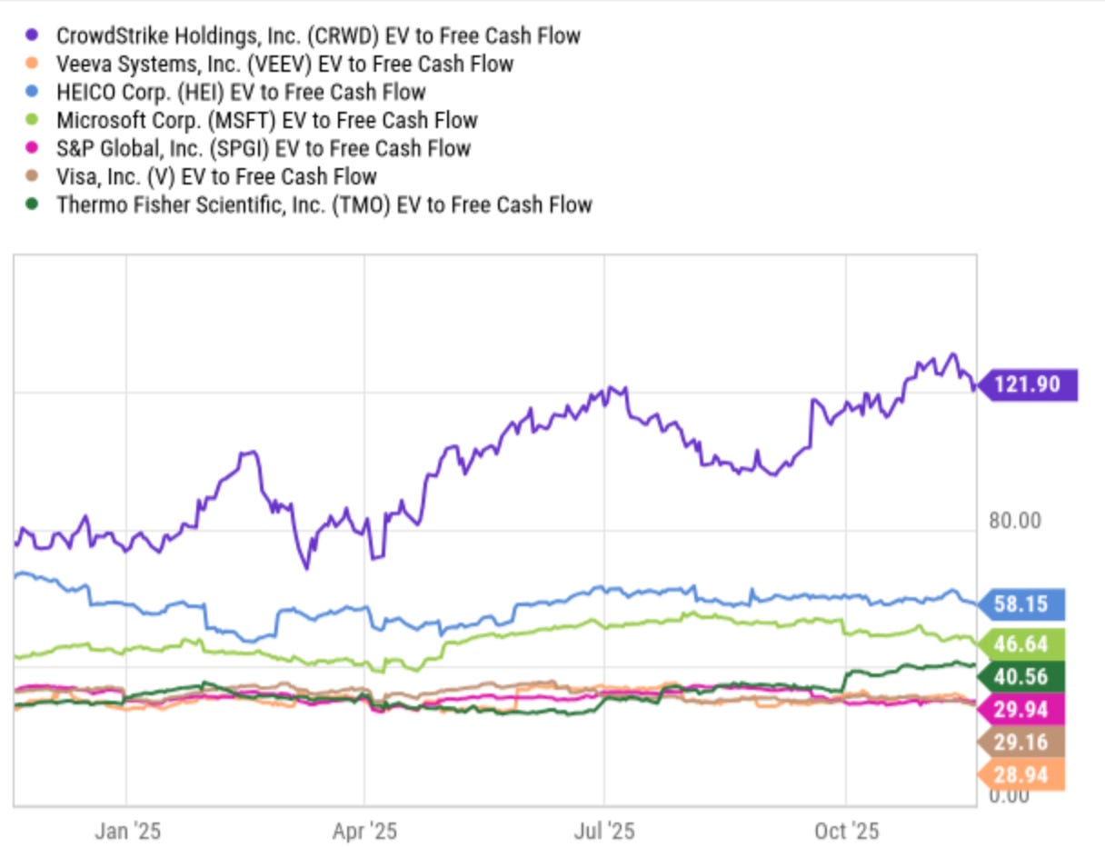 Let’s compare against the top companies. You are welcome to choose your own ‘top companies’, but I am picking a few as an example. These companies are often highly regarded by the market. Apart from CrowdStrike (which we own), the median EV/FCF multiple is 40x. All have lower growth potential than Wisetech.