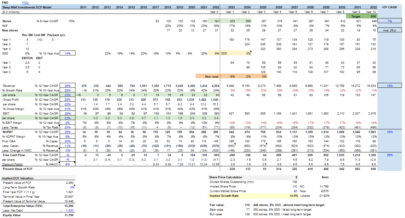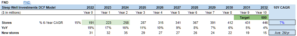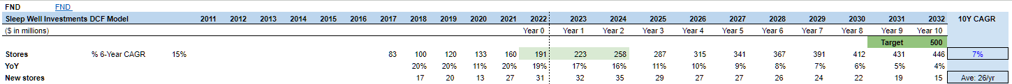 My original valuation (below) assumed FND would build new stores aggressively at a 20% CAGR for the next two years (39 stores in FY2023 and 45 stores in FY2024) and then slow down to a 7% CAGR until FY2032 to reach 450 stores (base case).