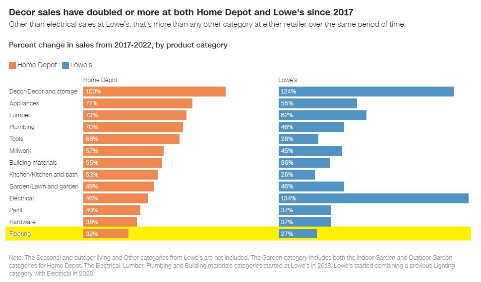 My number is consistent with the report below, showing HD and LOW’s poor performance in flooring in the last five years, growing sales only around 30% between 2017-2022.