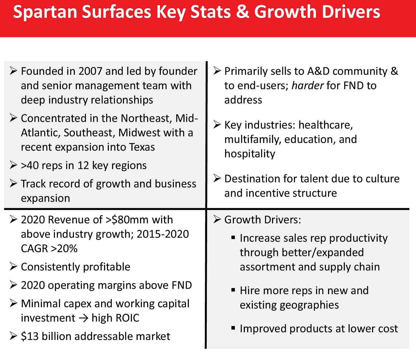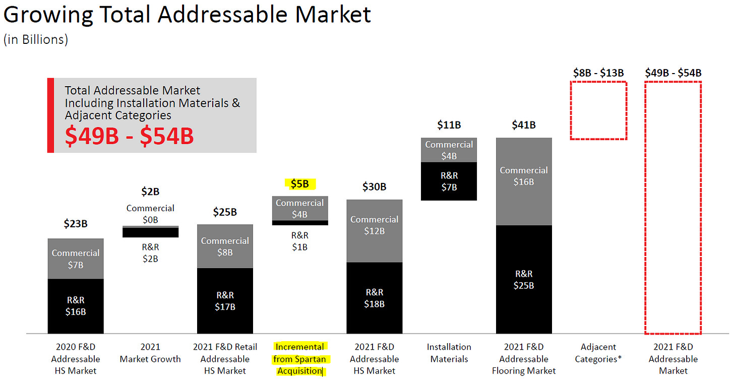 Spartan revenue increased 40.5% YoY, accelerating from 32% YoY in Q1. Management didn’t provide precise figures, but EBIT growth remained strong (74% YoY in Q1). Spartan acquired Sales Master Flooring Solutions, a top commercial flooring distributor in New York City. With a base revenue in 2020 of $80M, strong organic growth since acquired, and the recent acquisition, FND might have grown an extra arm to attack the $5B TAM.