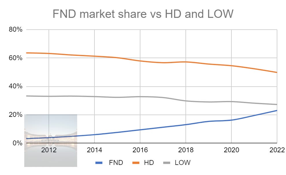 Floor & Decor’s market share (blue line) rose consistently from 2011 to 2022, at a loss from Home Depot and Lowe’s, the top two DIY mammoths.