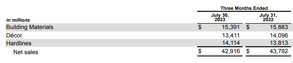 Looking at quarterly data, unfortunately, we can’t do the same like-for-like comparison. HD and LOW’s 10Qs bundle up sales. They only report three categories: Building materials, Decor, and Hardlines, and flooring is tucked under Decor.