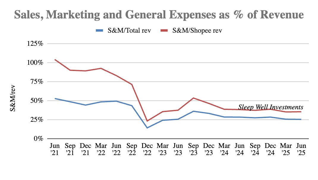 Sales and marketing continued to grow more slowly than revenue, despite operating in an intensely competitive environment. Now at 25% and 35% of Shopee’s revenue and the Group’s revenue.