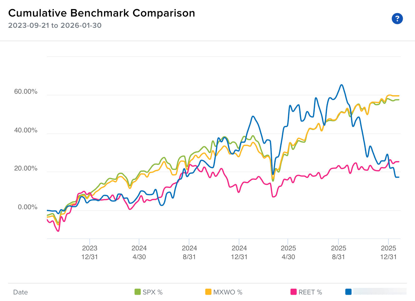 Return from inception was 17% vs. S&P500 58%: ~40% underperformance. Sharp decline from September 2025, when SWI was >60%, due to the high concentration in SE/WTC.