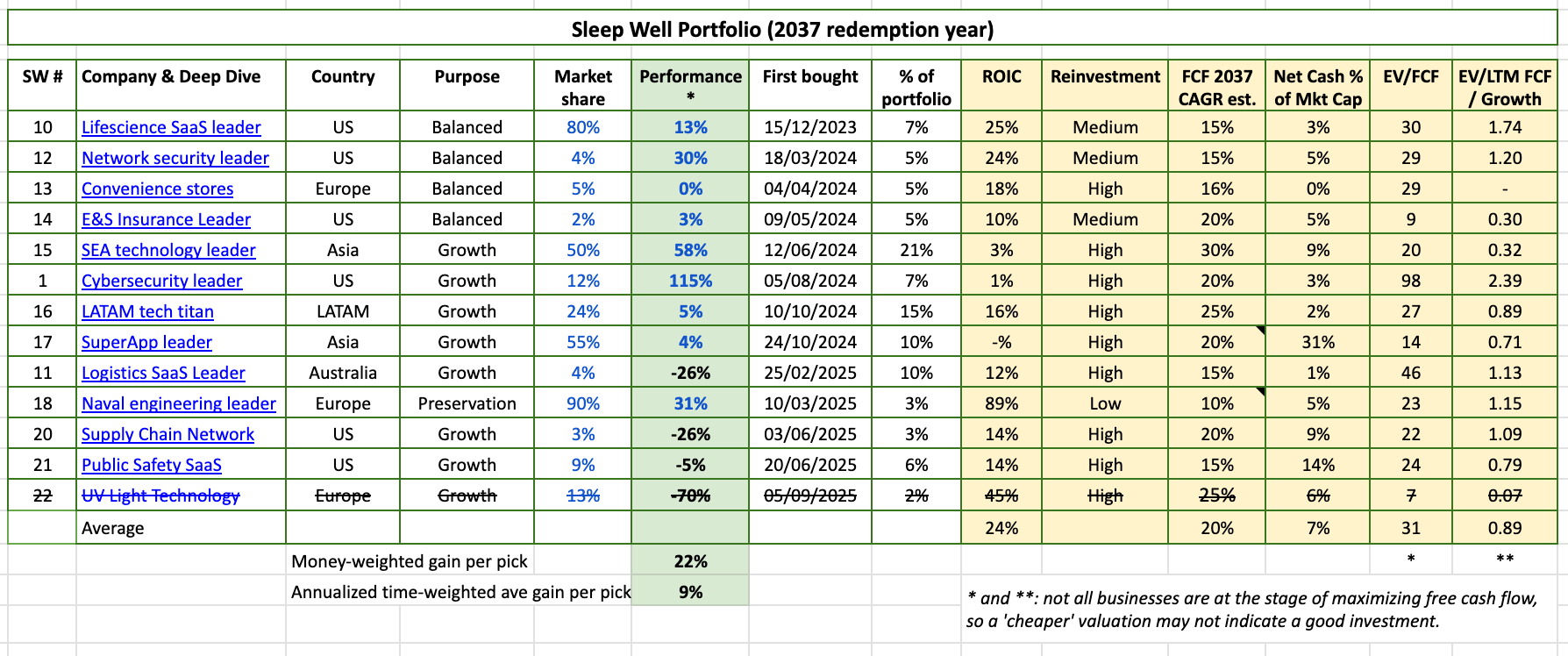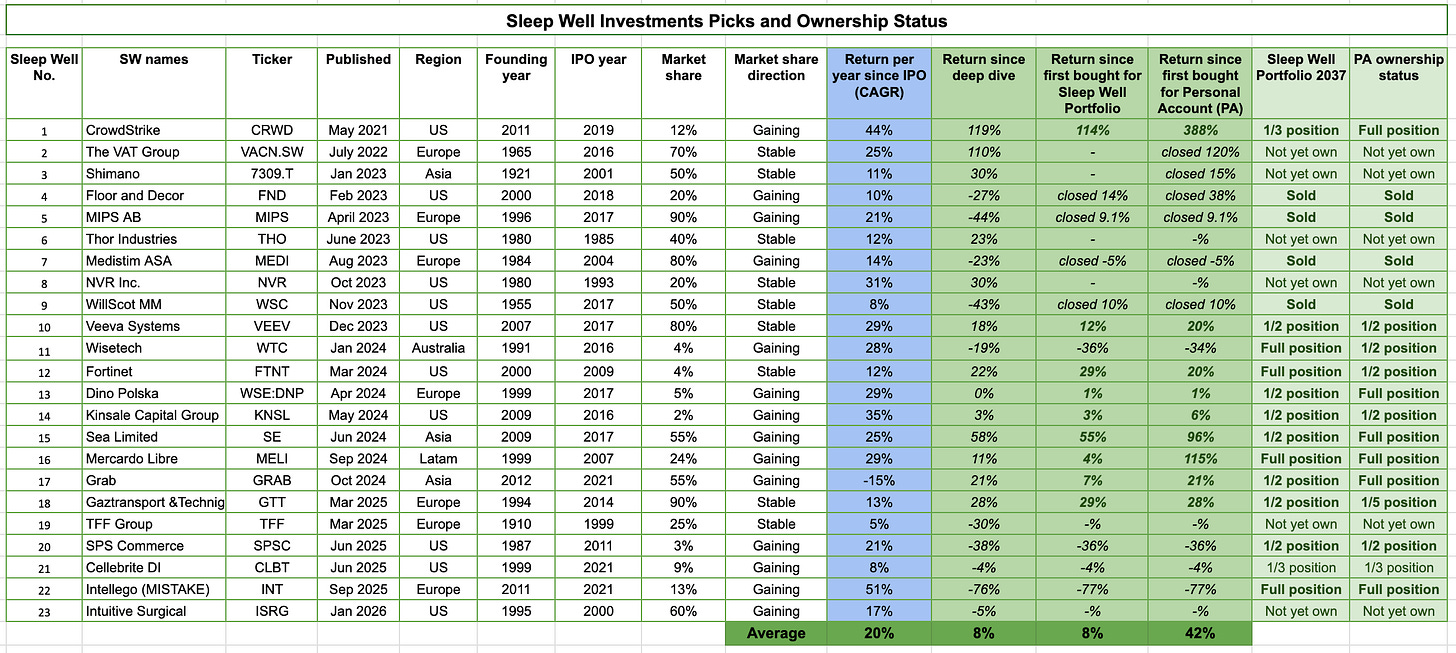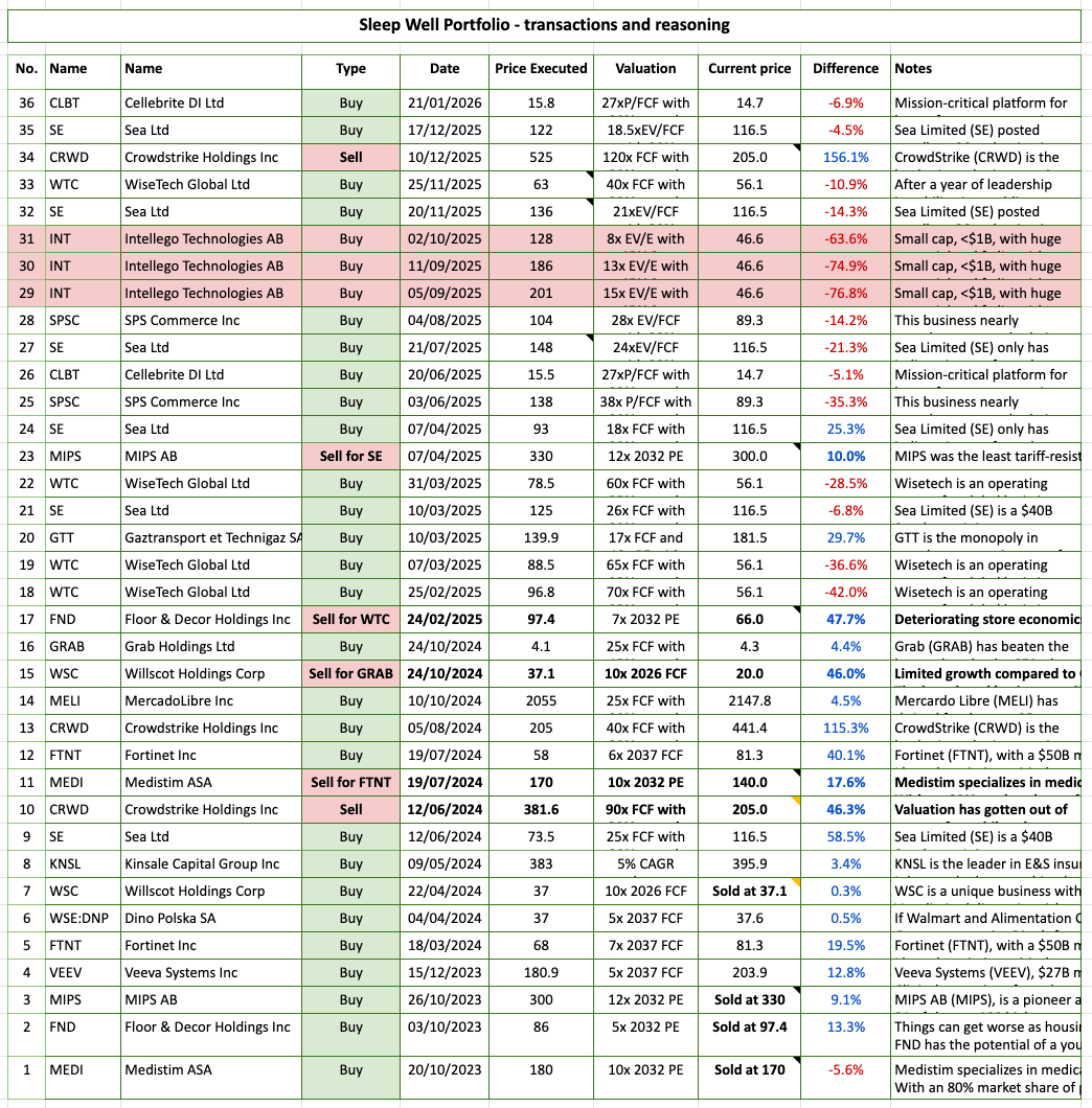 Sleep Well Portfolio consists of time-tested leaders. We screen them using a rigorous checklist and track their theses regularly to determine when to buy. So far, we have made one mistake, three losers, and 21 out of 36 transactions have been profitable. All about us here.