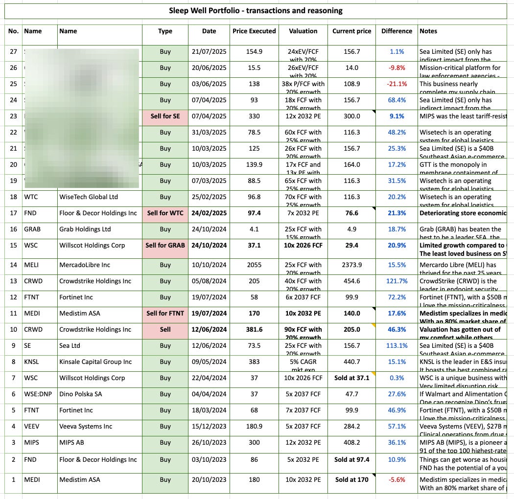 We are active in fearful periods and quiet in happy times. July saw a return of tariff uncertainties, and I am hoping for lower prices in the coming months. It’s a good time to review the tariff resistance health checks I wrote in March. I also reviewed Magnificent Seven, and used the volatility to buy more Sea Limited (up 72%), Wisetech (up 36%), and GTT (up 17%), and sold MIPS (for a 10% gain).