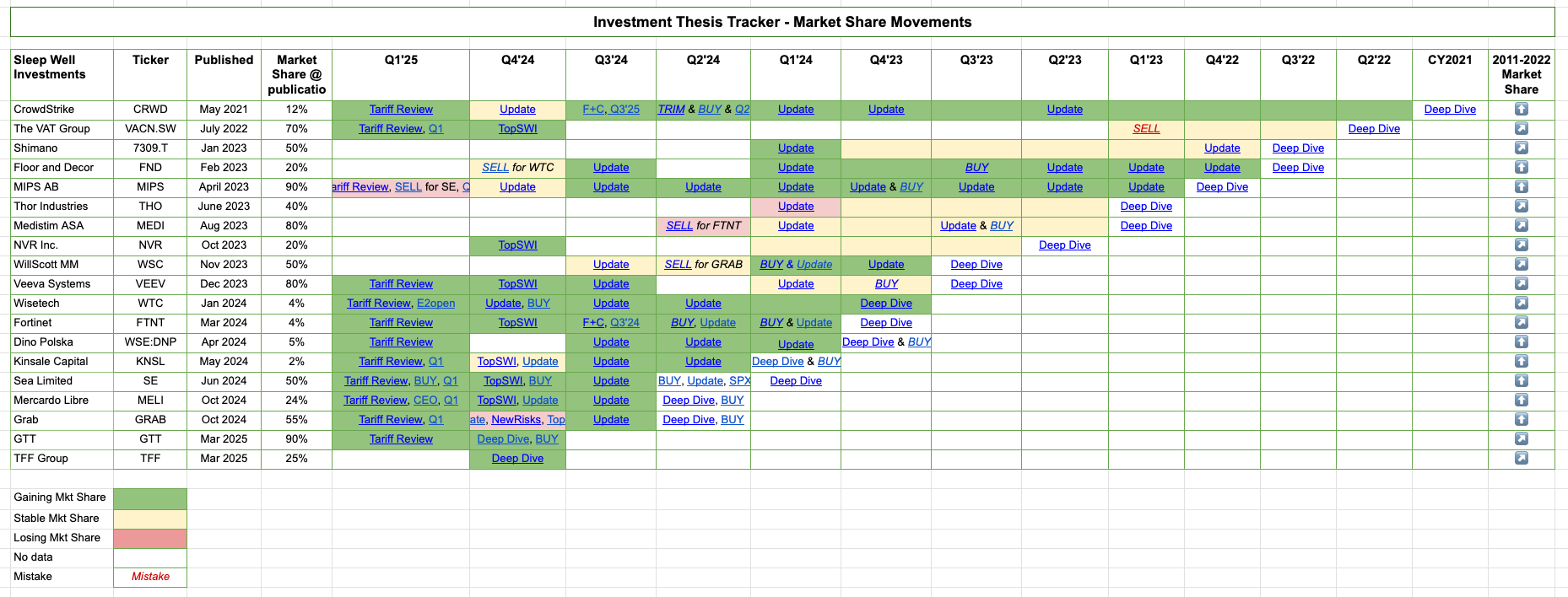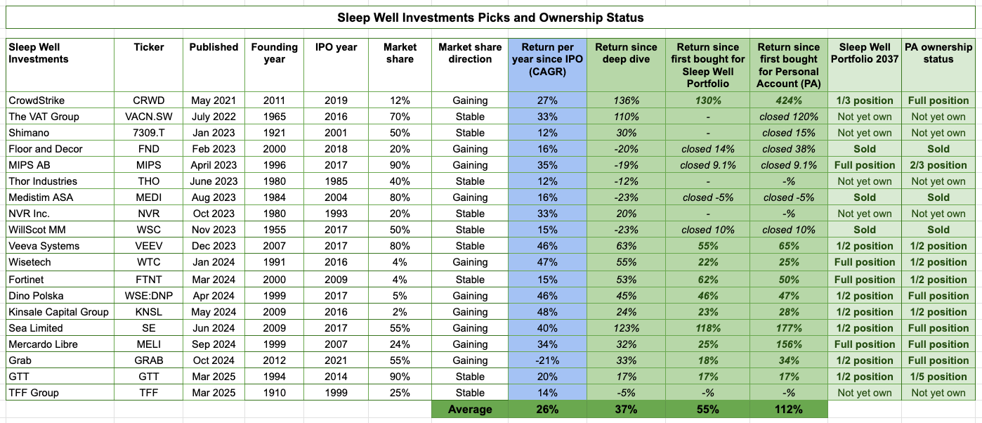 **Links to thesis updates, buy-and-sell, and deep dives are all in the Sleep Well Portfolio spreadsheet. (Annual Sub only)