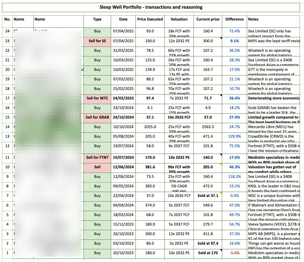 We are active in fearful periods and quiet in happy times. In March and April, we reviewed every pick for tariff resistance, reviewed Magnificent Seven, bought Sea Limited (up 72%), Wisetech (up 36%), and GTT (up 17%), and sold MIPS (for a 10% gain).