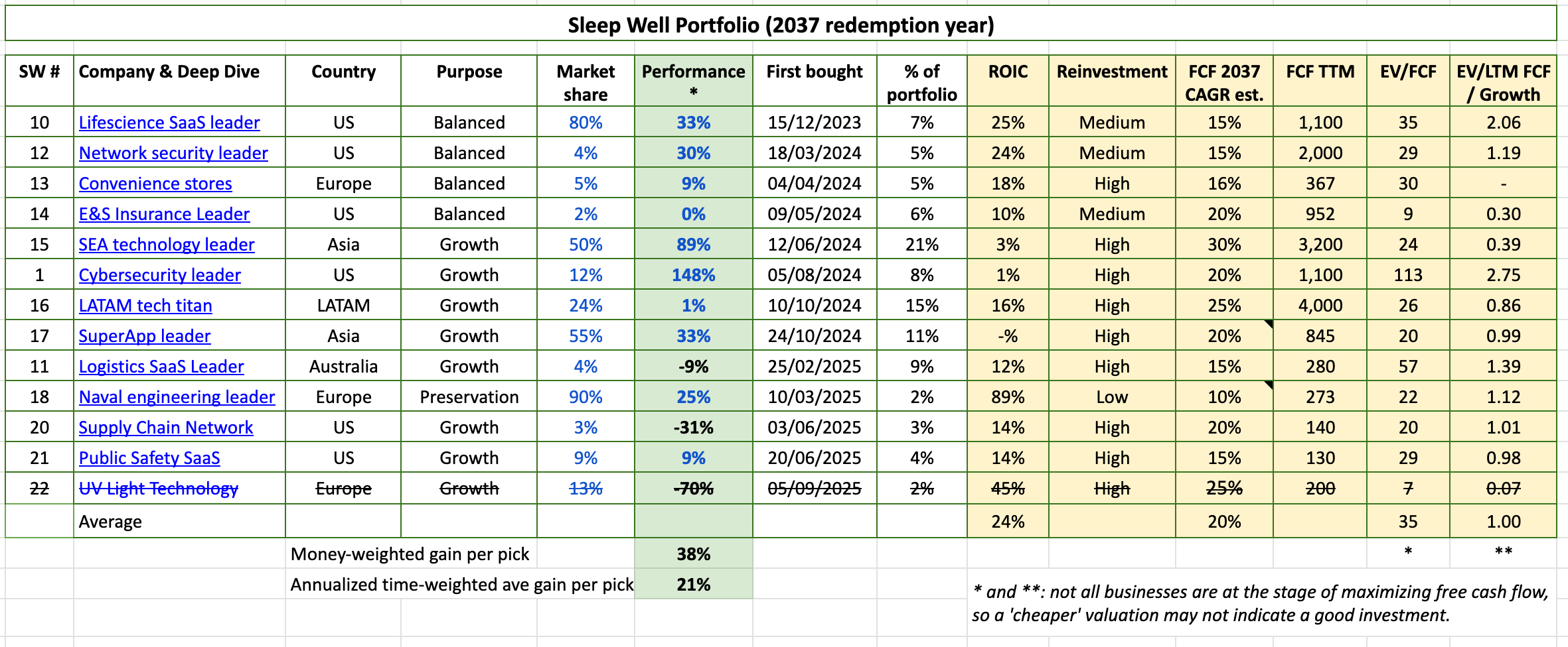 Sleep Well Portfolio consists of time-tested leaders. We screen them using a rigorous checklist and track their theses regularly to determine when to buy. So far, we have made one mistake, three losers, and 23 out of 33 transactions have been profitable. All about us here.