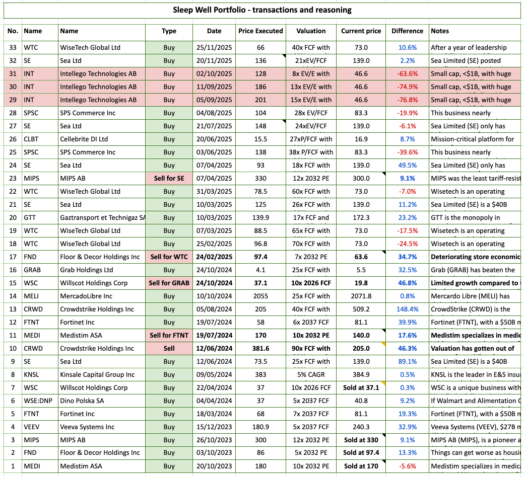 I expect a rebound. SE and MELI are trading at ~20x FCF for mid-term 20%+ growth and a very low chance of being disrupted from their 50%+ and 30% leadership position. Monetization is just starting from years of building moats around the ‘castle’. I believe those two alone will turn my current underperformance around. A detailed study of SE’s valuation was conducted here on 17th November. Next, I also have strong reasons to think WTC will do well in 2026, but the transition for the new CEO and commercial revenue model will take time. Hence,