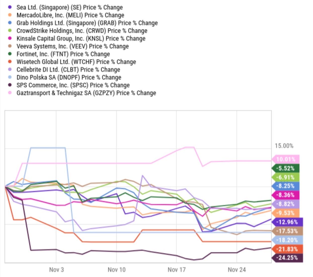 Declines in core positions SE (20%), WTC (9%), MELI (15%), and KSNL (5%) dragged the portfolio down from overperformance to underperformance for the second month. These are temporary.