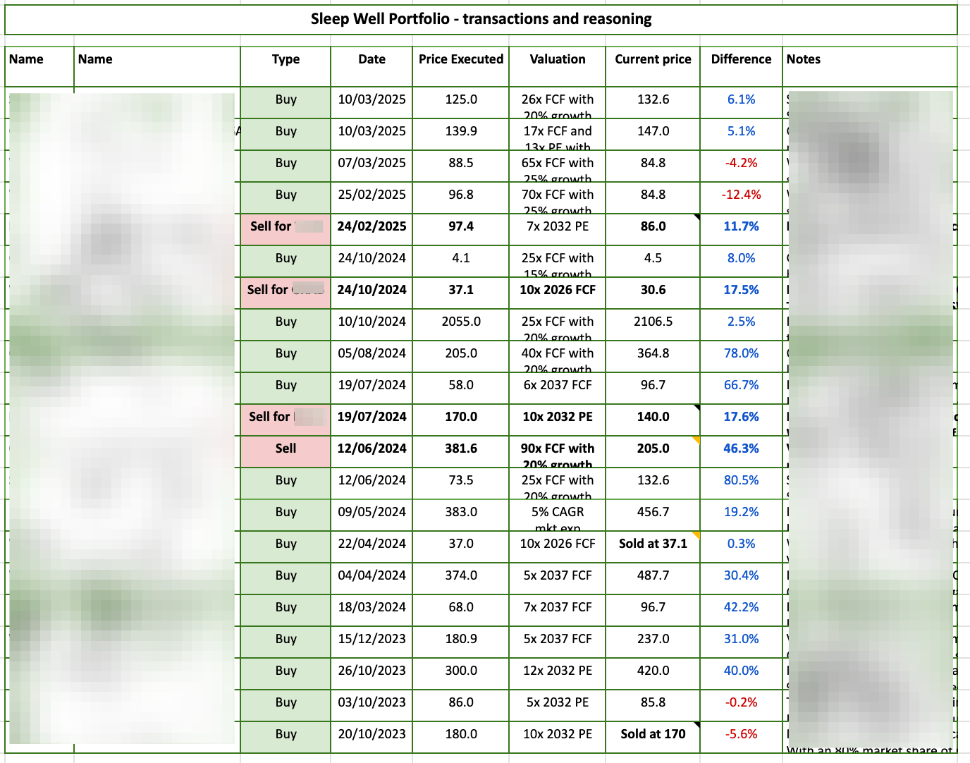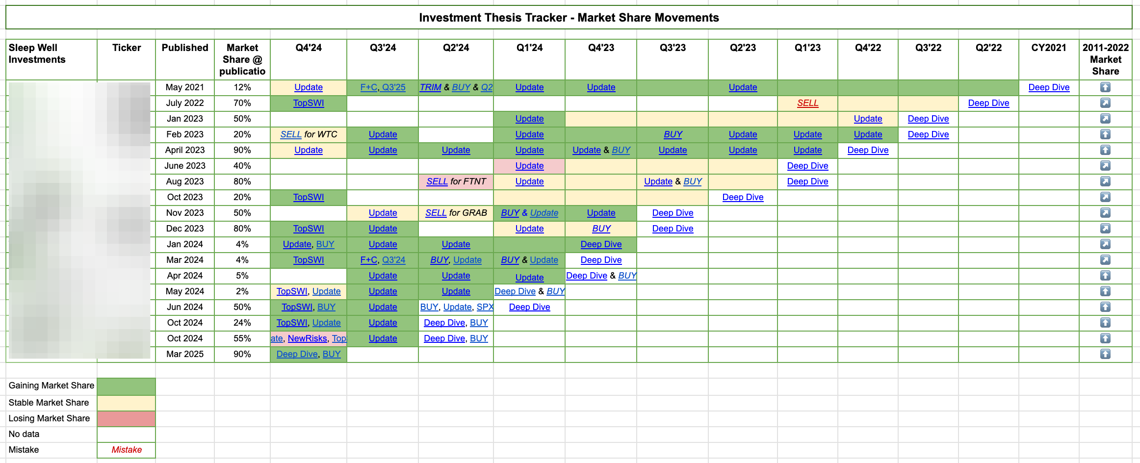 I track all holdings methodologically to identify mistakes early and capitalize on market overactions. 4 sales out of 4 have been correct, and 9 out of 10 purchases have an average gain of 49%.