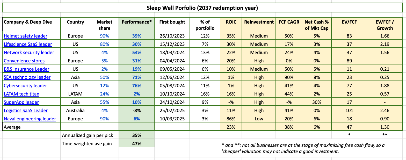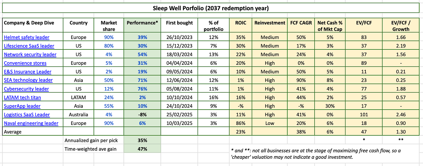 The Sleep Well Portfolio outperforms the S&P500 by 16%, with average holding gains of 47%. I’m proud that all holdings are niche leaders diversified across countries, industries, and business models. What’s more? There is only one loser.
