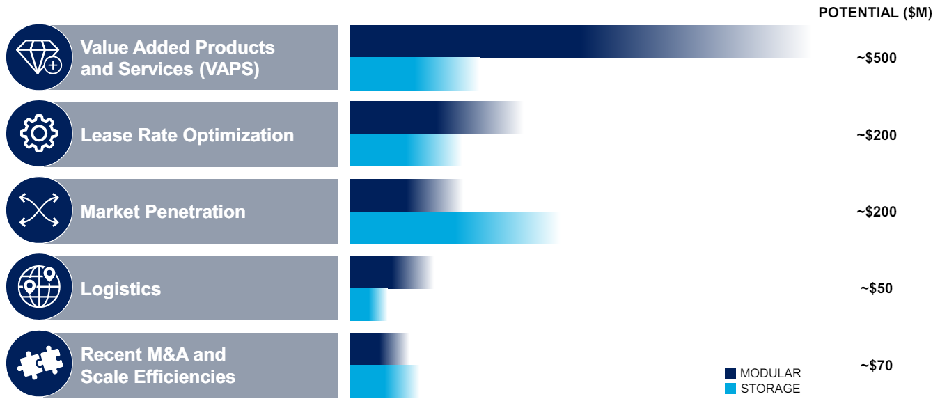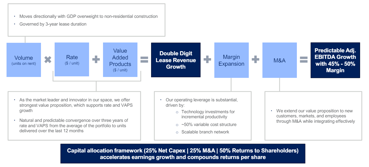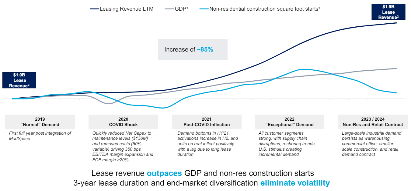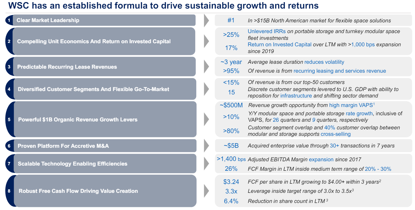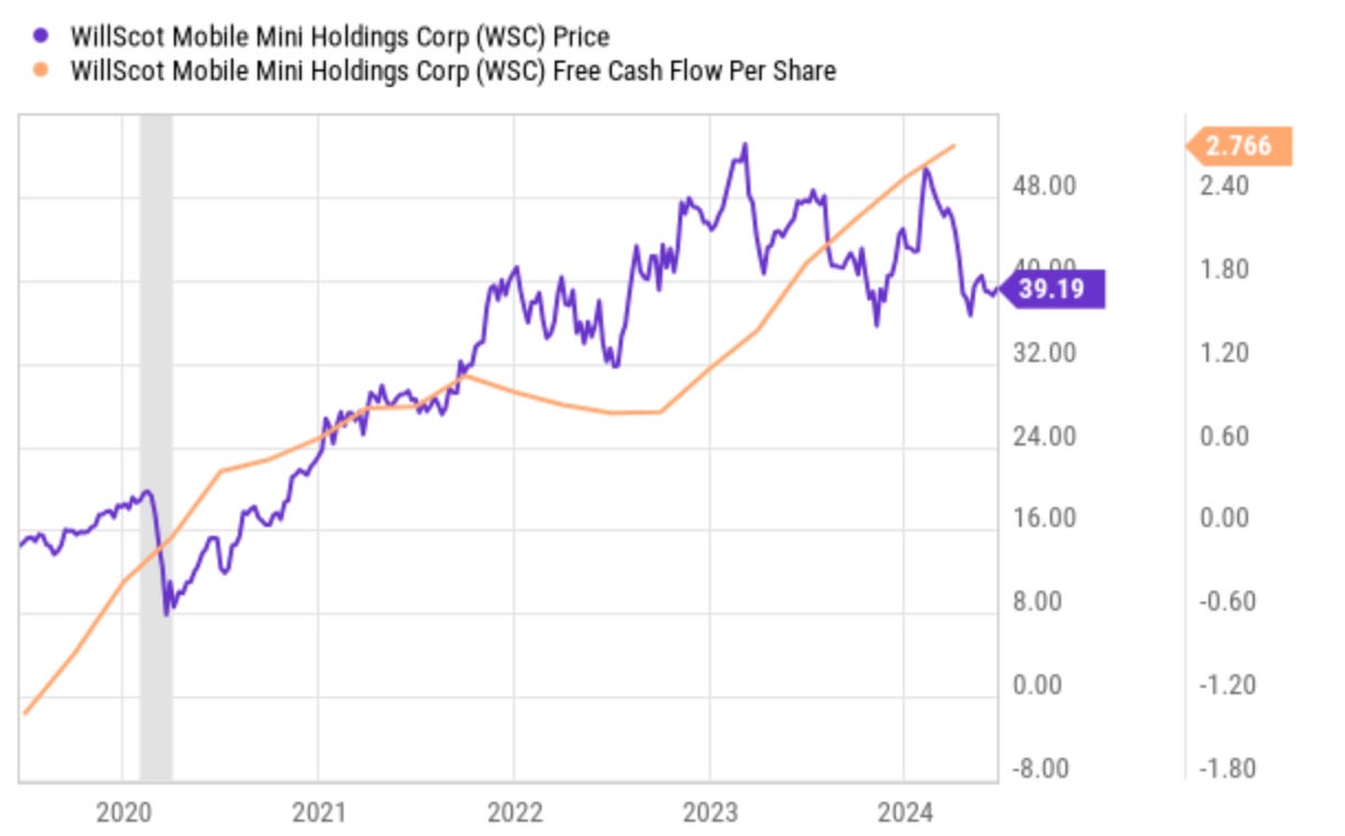 As a result, the management has multiple levers to maintain free cash flow per share growth (resilient rates, VAPs, cost optimizations, accretive M&As, repurchasing shares). As a leader, when construction activities return, WillScot is poised to capture the volume increase, completing a powerful and adaptive compounding algorithm.