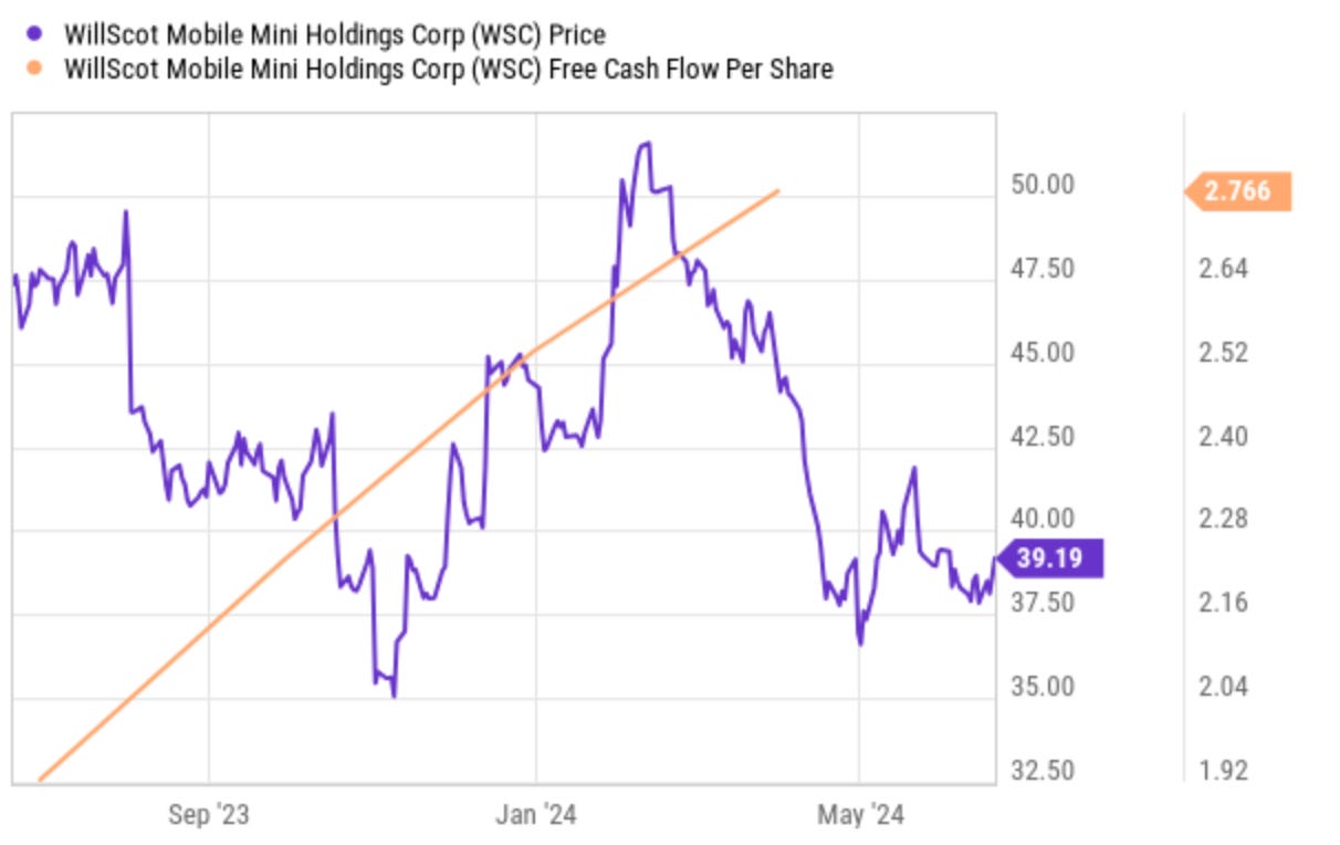 I bought WillScott at $37/share without considering any particular catalyst, only that WillScott remains a niche market leader and that the orange line above—free cash flow per share—keeps growing.