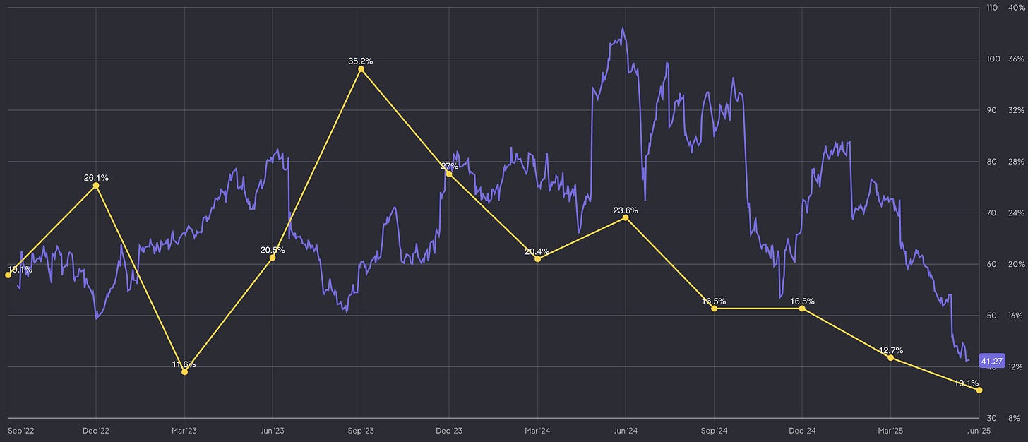 You could say the moderating top-line growth since Q4’2024 caused the fall.